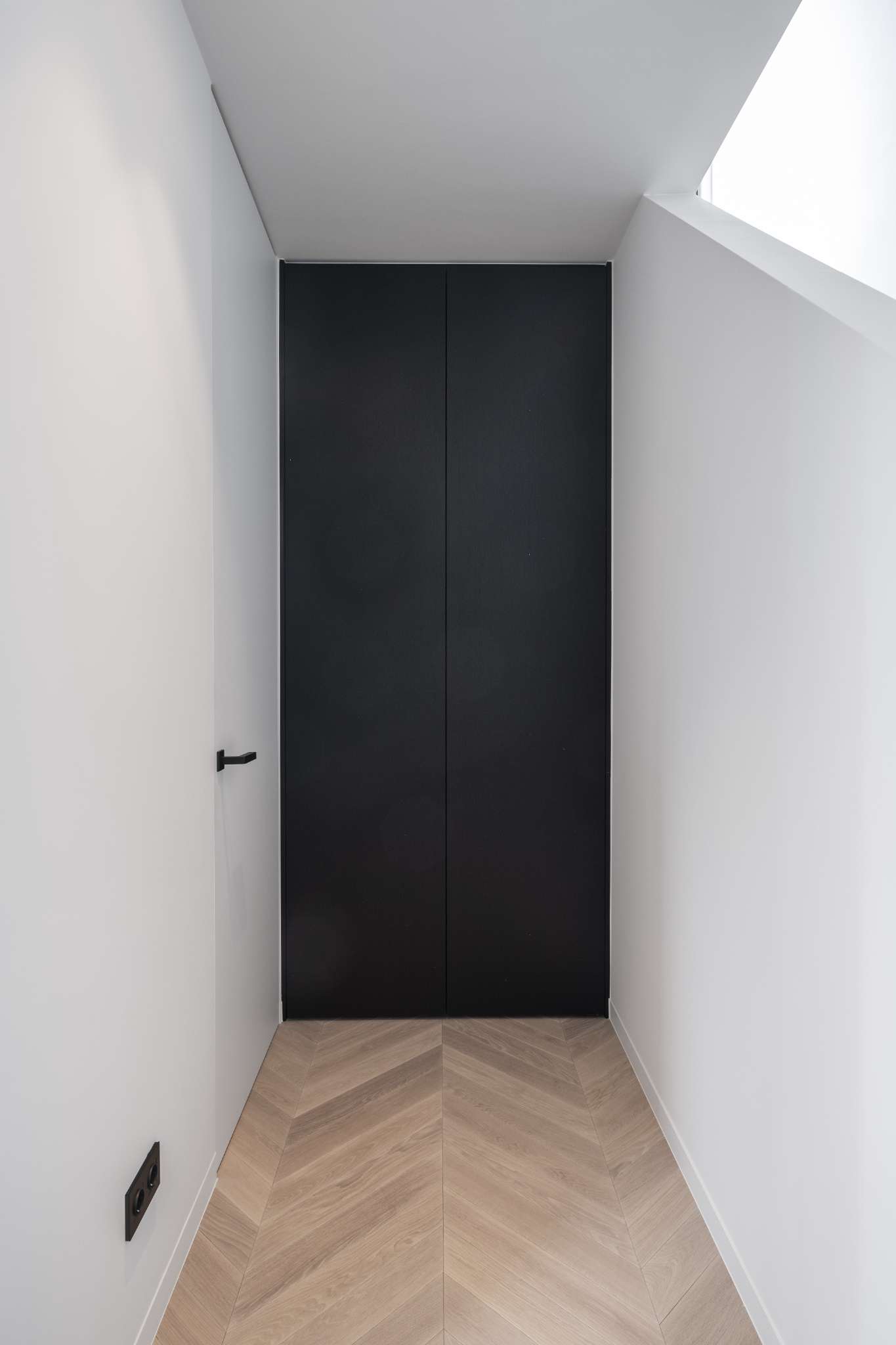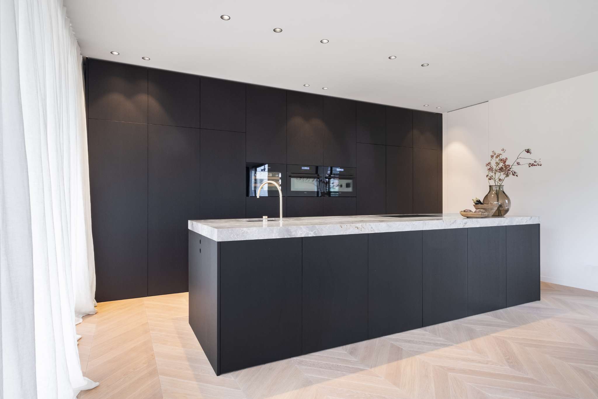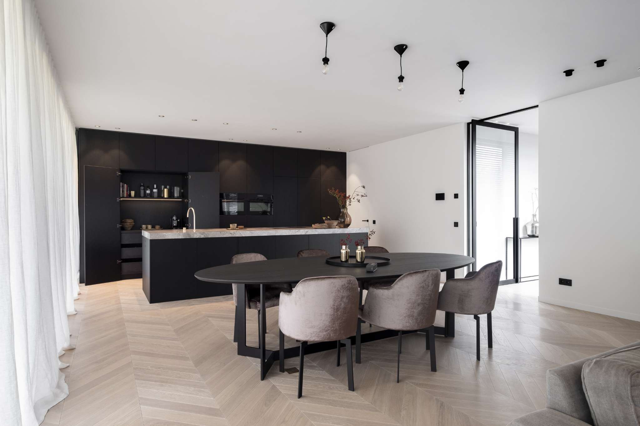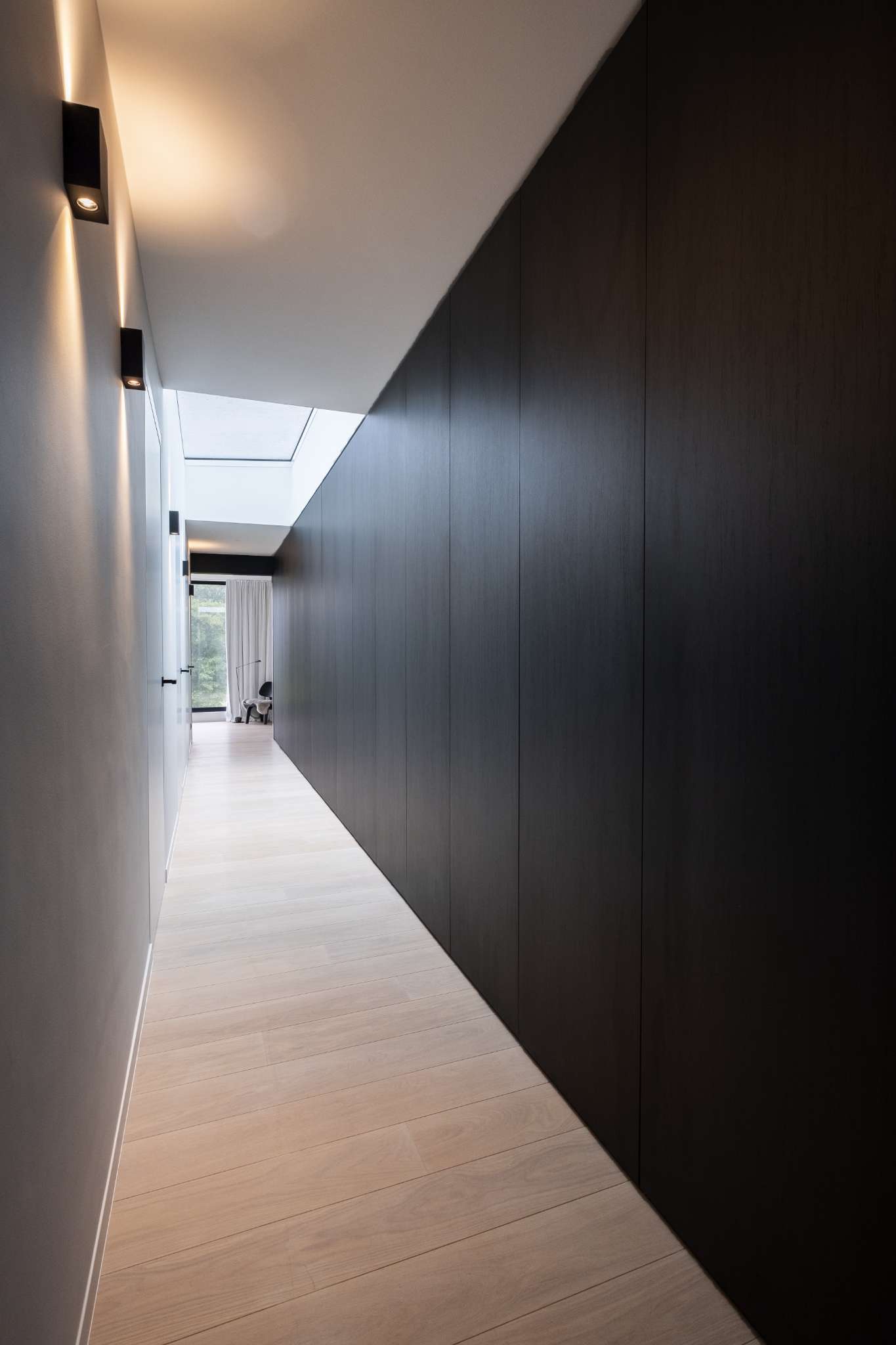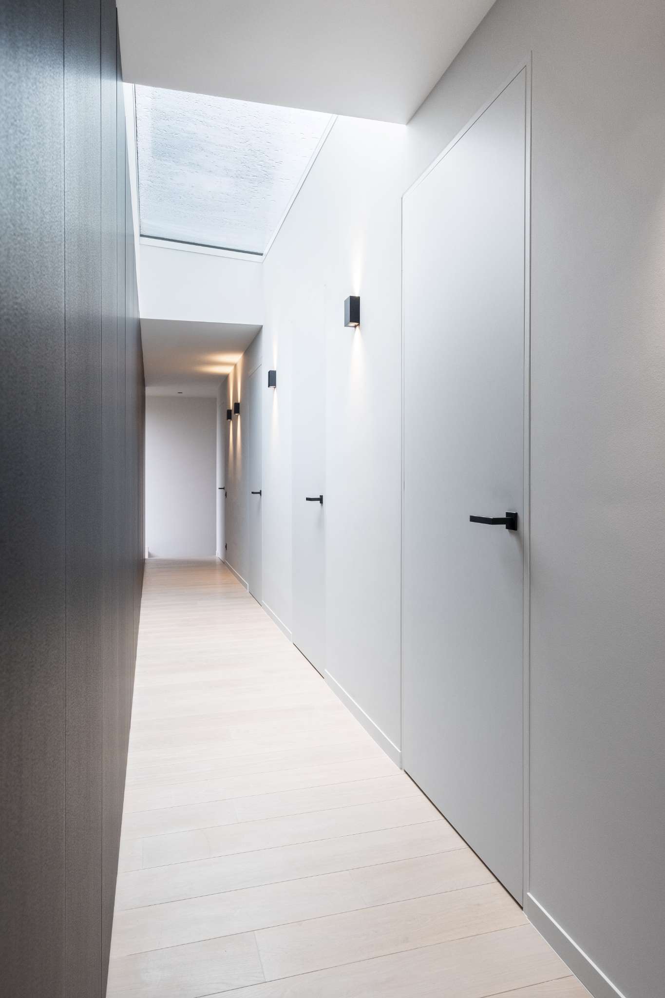 Het project werd gestart met een buitenschrijnwerk op maat, en het is fijn dat we hier de klant met konden overtuigen waardoor we ook het volledige interieur maatwerk mochten uitwerken, van keuken, badkamer en dressing tot binnendeuren en parket.