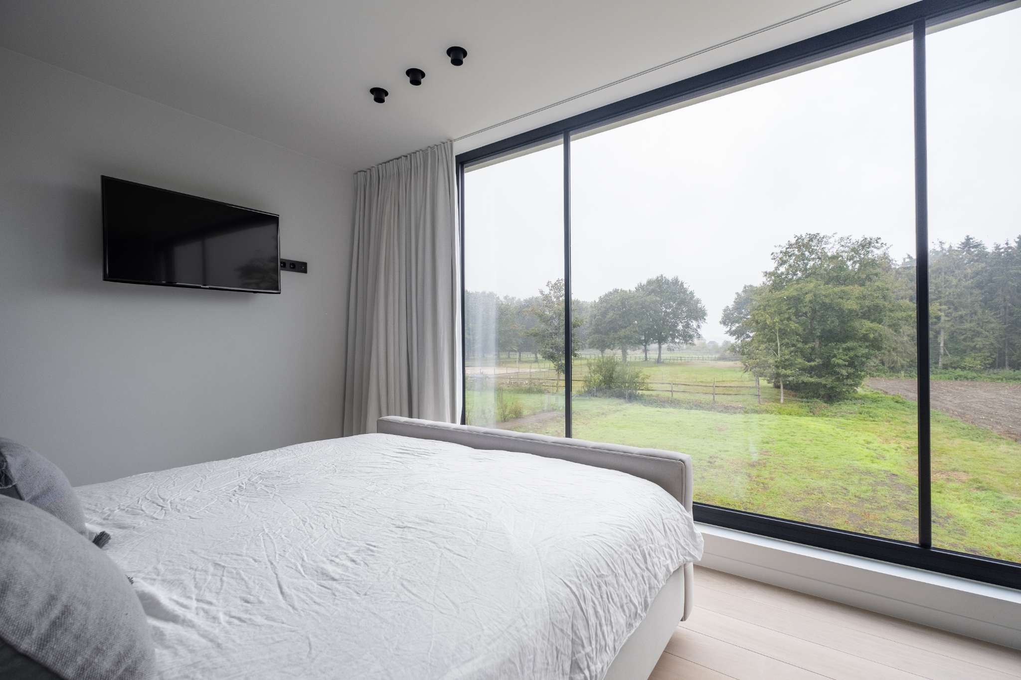 Grote glaspartijen in de leefruimte en de slaapkamer zuigen deze groene omgeving naar binnen.
