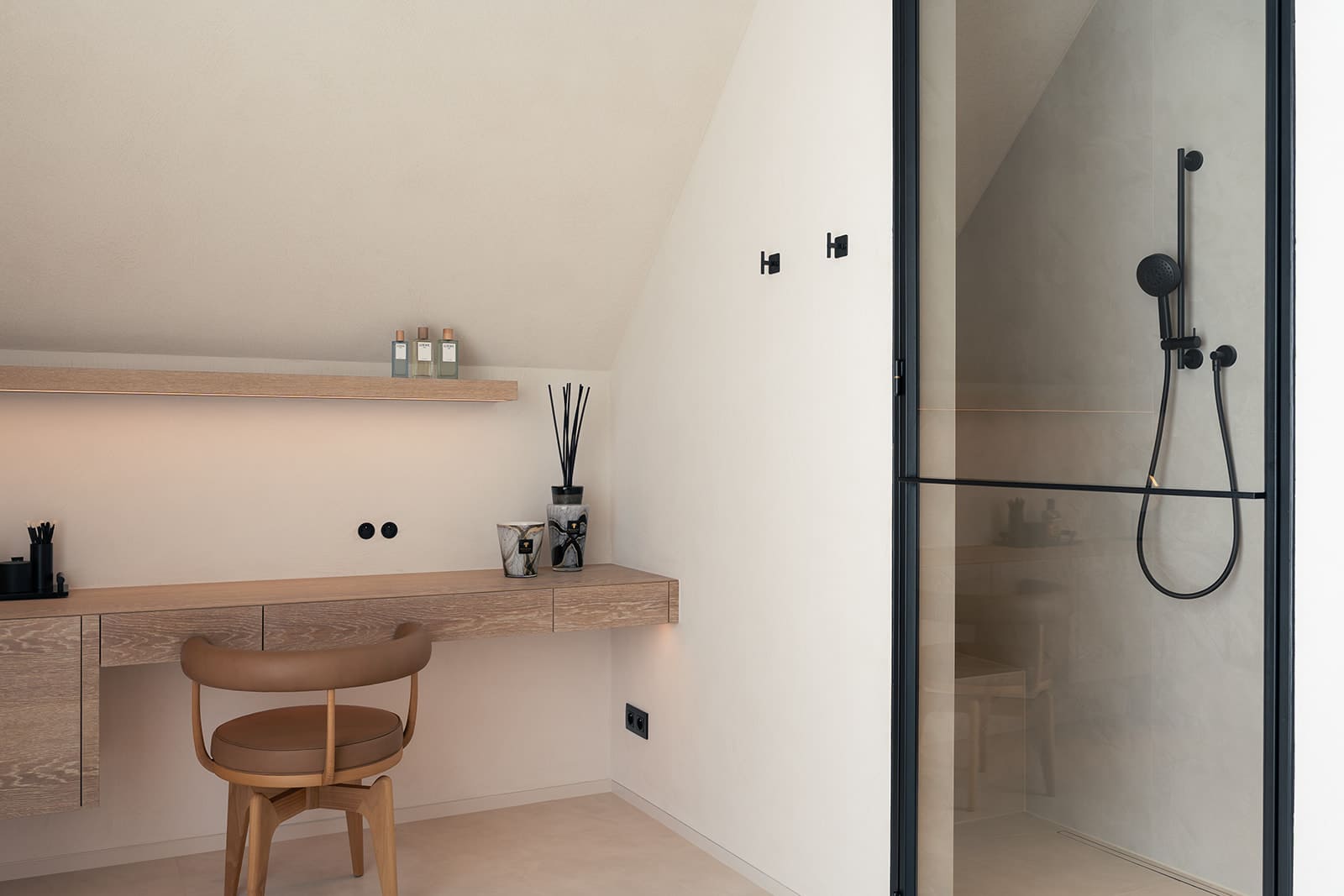 Binnen realiseerden we een open, luchtige indeling met een op maat ontworpen keuken, leefruimte, bureau, badkamers en een droom van een dressing. Alles in zachte aardetinten, warme houtsoorten en pure, natuurlijke materialen – kenmerkend voor de tijdloze Ibiza-sfeer.